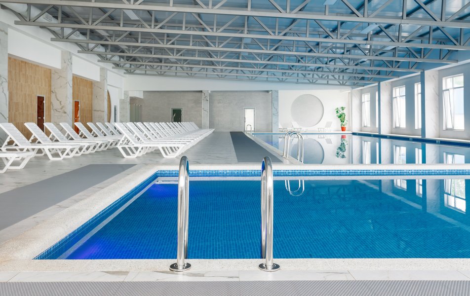 - Крытый малый бассейн – площадь 90 м², размеры 6 × 15 м, глубина 0,6 м, подходит для детей и взрослых. Рядом душ и шезлонги.