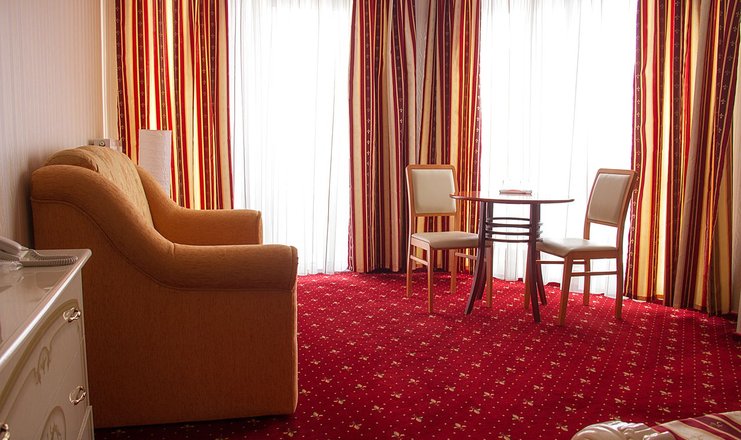 В номере: диван, зеркало, кровать двуспальная, прикроватные тумбочки, стол, стулья, кондиционер, мини-холодильник, сейф, телевизор ЖК, телефон